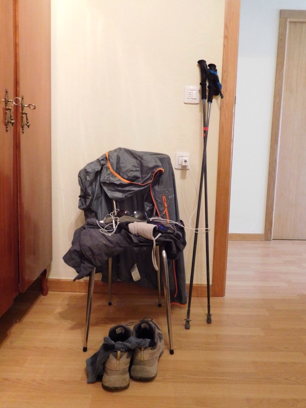 The Camino redefines how you spend a Saturday night. I was off the trail early and had an evening in. I was delighted to find a big pair of toenail clipper at the grocery. I can’t stand those tiny ones. I added this to my basket of goodies and headed back to the pension. My room was 10’x12′ and just the basics. Single bed where I could almost lay flat if diagonally oriented, a tiny dresser, an equally small chair and a wardrobe made of wood usually reserved for disposable fruit crates. No pictures on the walls. Shared bathroom down the hall. I also got a chip of soap and a bath towel. That’s just fine for €25. I was tempted to go down to the “nightclub” two doors down. Apparently a nightclub is defined by a bar with the addition of a disco light and some sort of sound system. I opted for a quiet night in and I munched on corn nuts and drank beer with seltzer water. Light light light beer. I watched Fury on my iPhone, trimmed my toenails and watched my laundry dry. It was a wonderful way to spend an evening.The nightclub was just opening as I went to bed. Fortunately I couldn’t hear a peep from my room. I got a good nights sleep.