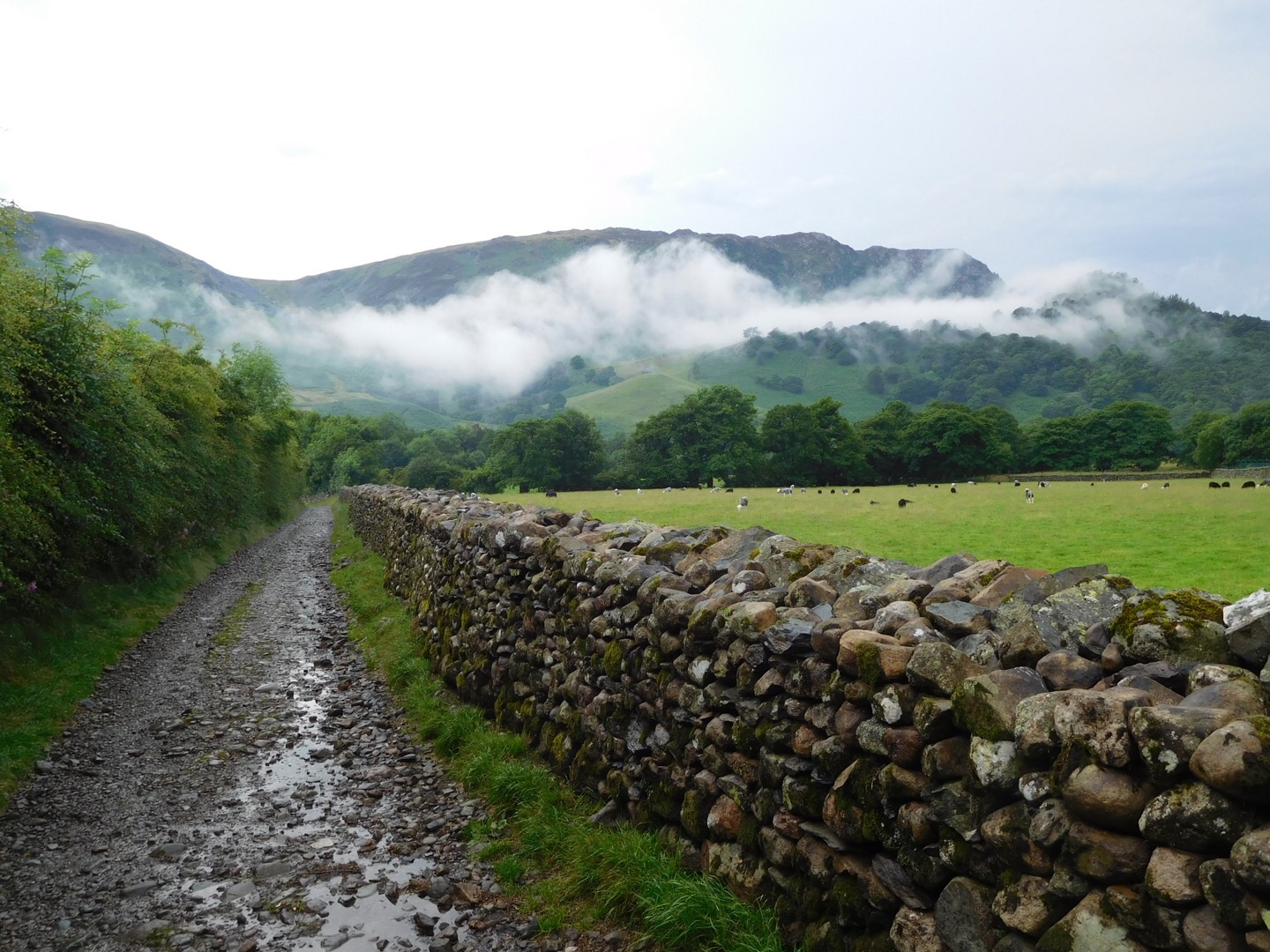 The woods continued and rolled over gentle hills on comfortable grass and down to a lake where I walked the shore north to Keswick.
