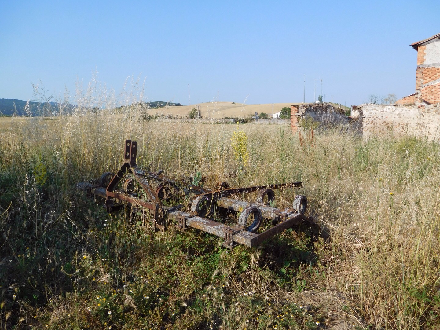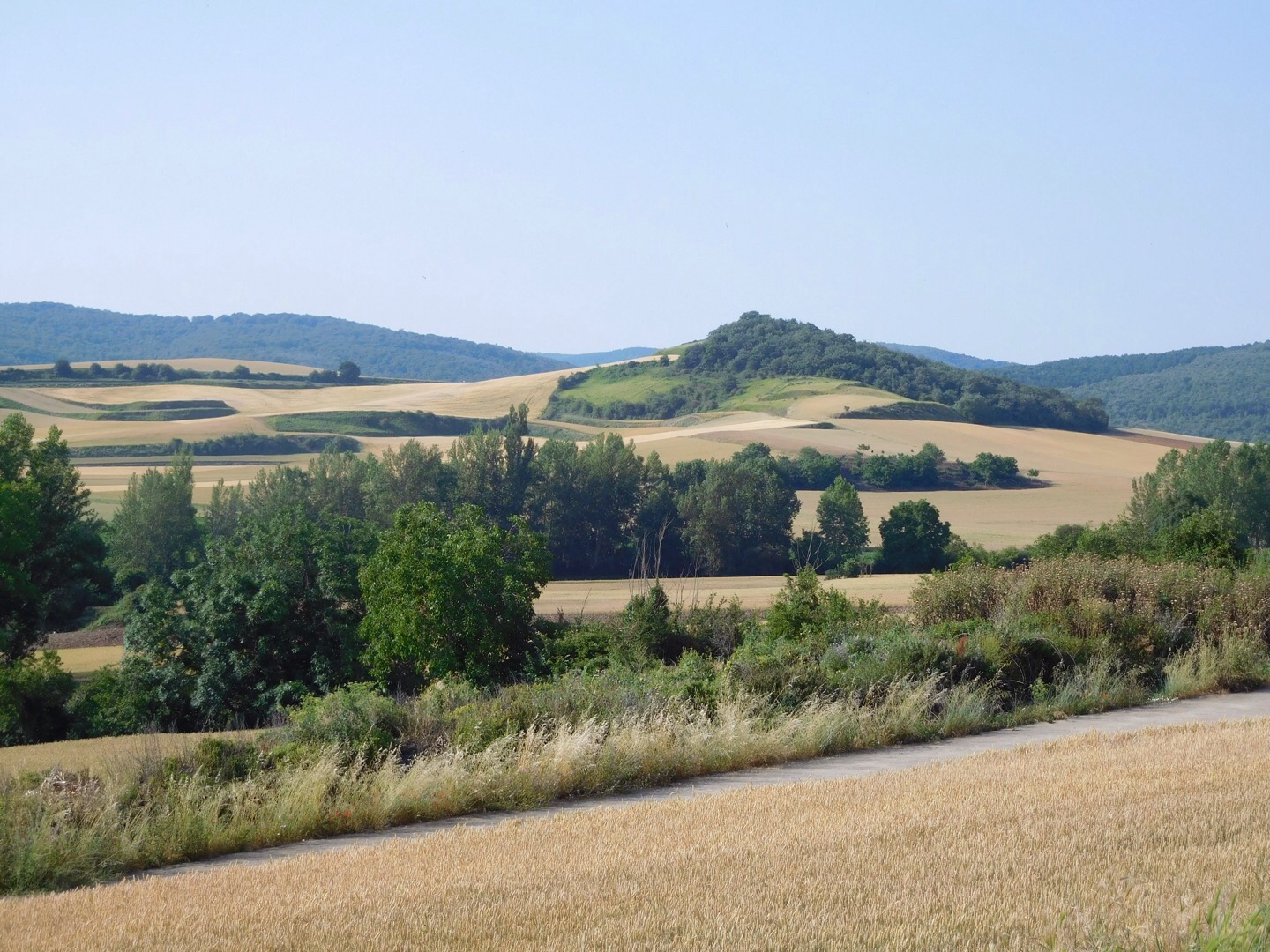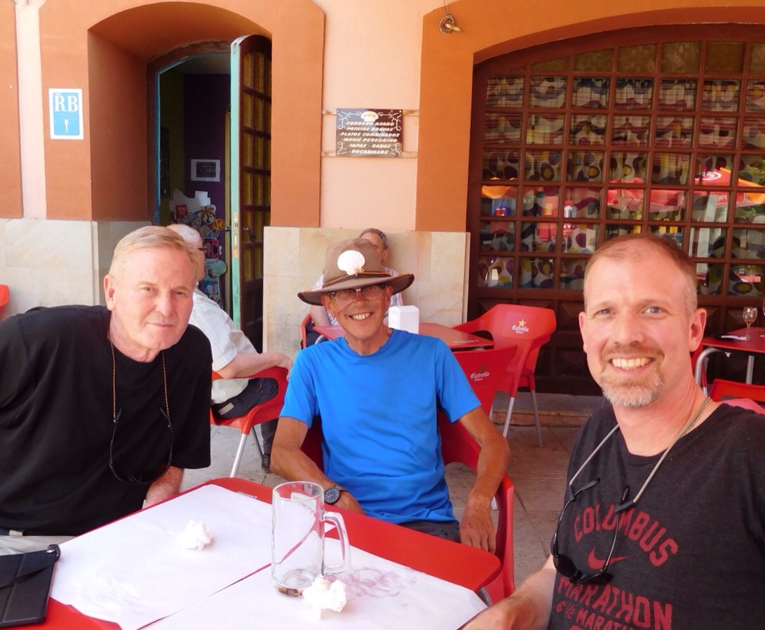 I’m in the Meseta, it’s a long hot haul, over 100 degrees. 16 miles in this heat is tough. Pilgrims a lot quieter today. Wheat fields and gravel roads, no shade. Visited a small church in Villambistia. One of the best sunrises I’ve seen on this trip. Kept my head low and cranked out the miles as the day got warmer. Had yogurt and a tin of sardines for breakfast. Had an expresso and a chocolate croissant for second breakfast. Drank constantly, one great thing about the Camino is the access to water. Didn’t really stop till I reached Belorado. Made good time, was in a pension by 1:00. Had tomato, mozzarella and tuna salad with a tall beer for lunch. Enjoyed conversation with Bob from South Carolina and Danny from England. Danny (middle in pic below) is a serious road warrior, he’s been on his Camino for 91 days! I met Bob at the Orission Alberge my first night. Good to see familiar faces. Wifi here is lame, but facility is nice. Dinner and cathedral later. Tough day tomorrow heat and hills, going to bed early!