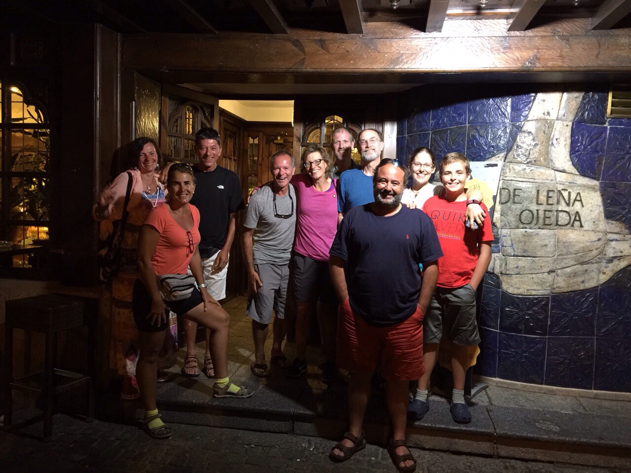 I tried not to start my camino with any assumptions. I expected it to be challenging in ways I couldn’t anticipate. I hoped to meet interesting people along the way. I had no idea of the wonderful comradery between pilgrims. Richard and Patricia, who I had seen on the trail for the past few days coordinated a dinner last night and it has been one of the highlights of the trip so far! We met in front of the cathedral. Himey, a pilgrims in the group, was familiar with Bergos and was excited to share its culinary treasures. We started the evening at a small bar with big plates of potato with a delicious garlic cream sauce, steamed muscles and cold beer. The black and white tile bar had a stainless steel trough running its length on the floor with the specific purpose of collecting shells, napkins and the toothpicks generated while consuming the amazing food. Conversation was in Spanish, English, German and French but smiles and laughter are universal and contagious. Patricia and Himey coordinated our next stop of the evening via cell phone and our group was off through packed city streets to a restaurant specializing in Cordero (Lamb). Food on this trip has divided into two categories. The first is simple food for fuel, like a tin of sardines and a couple of yogurt for 1st breakfast. The second would be the unique and well prepared meals I’ve had. I’ve been fortunate that many meals have been in both categories! Dinner last night was a whole different level. The decor was a really cool 1970s vibe steakhouse with lots of heavy carved dark wood, but nicely set against a bright clean background. We shared an appetizer of anchovy with red pepper on puff pastry. I love anchovy, and they were amazing! The lamb was served in large wooden bowls family style with a simple plate of lettuce and sliced raw onion. The lamb was expertly roasted and cut into large chunks. The seasoning was very simple and delicious. The textures are what stole the show. Crispy contrasting fall apart tender, simple and amazing. The complexity came with the wine pairing. This was a “sommelier rocked it” pairing. Amazing on its own, but to a new level paired with the meal. We sang Patricia happy birthday loudly and in four languages. I was amazing by the energy of a group that started the day at 5:00am and had hiked 15 plus miles! By 11:00 the city was still winding up, but pilgrims need rest and we said goodbyes and headed for hotels.