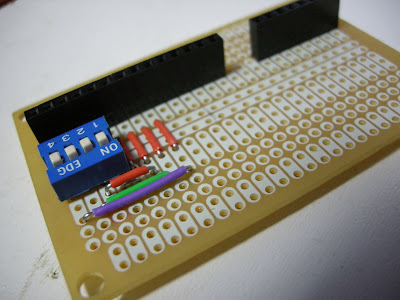 The potentieometers will feed the headers on this protoboard along with the 4 dip switches shown