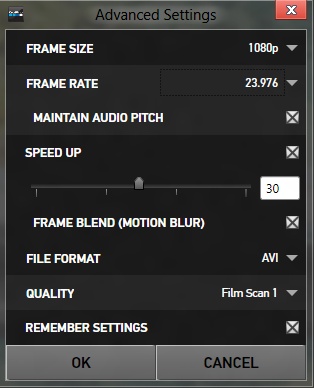 Continuing with the target of 5 second exposure and with 10 second interval, I was intending to model 180 degree shutter, however the CineForm Studio software with the Motion Blur enabled will simulate 360 degree (this was by design.) So setting “SPEED UP” to 60, “FRAME BLEND (MOTION BLUR)” on and the output frame rate to 23.976p, the result will be a clip with 5 second exposure and a 5 second interval.