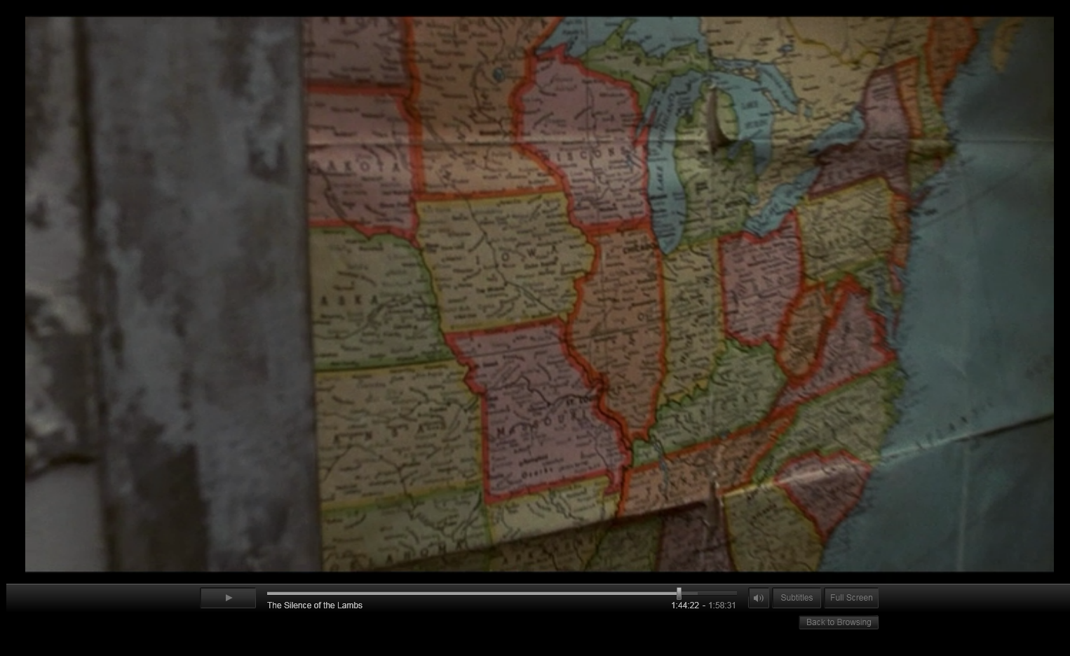 I have several poster sized prints that I had scanned earlier this week, one was a 1960s map of the US that i found at a flea market. I like the colors and the general patina of a 50 year old document. Bizarre coincidence, I was watching Silence of the Lambs on Netflix and what does Jody Foster creep by before the lights go out in Buffalo Bills basement? THE EXACT SAME MAP!