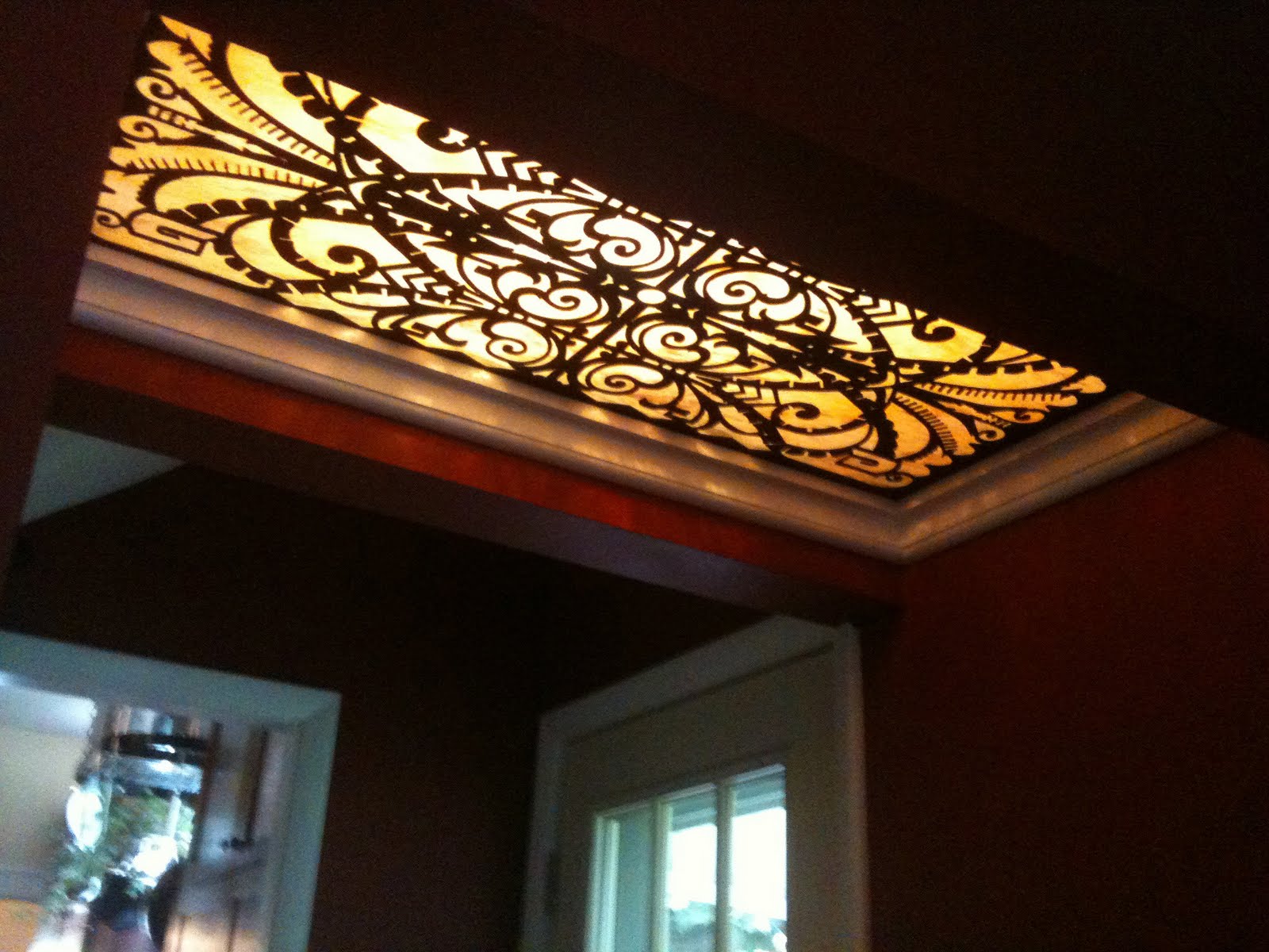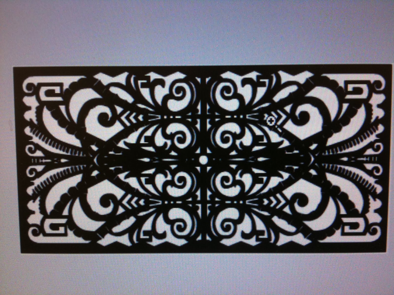 This is the best printer ever, cuts steel like butter! I designed in Autocad and exported to illustrator to fine tune bezier curves. DXF export for the CNC process. I built a pine frame in place to hold the cut panel and toped it with a great sheet of art glass from Franklin Art Glass. A compact fluorescent fixture lights the panel.