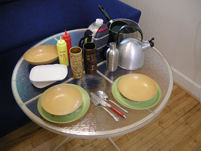Oh yet another project…. It’s a hip little pop up camper I purchased two years ago as housing for summer grad school classes. It’s in the process of a makeover, primarily a little repair of some mouse nibbling on canvas and screen that occurred in the past. Anyways, its a cool late 60’s early 70’s camper with a great brown, tan, wood grain, wicker interior. I’ve been thrift store hunting for a while to collect the proper accoutrements. Shown below are the kitchen wares: