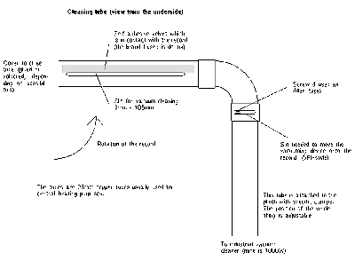 This is the description of a record cleaning machine I built. It uses an industrial wet vacuum cleaner with 1000W to suck the cleaning fluid from the record. The fluid is applied by swinging a tube over the record and pumping with a manual pump. The platter is rotated manually and a normal paint brush can be used to get the dirt out of the grooves. I use a professional brush from a Moth record cleaning machine. After that the sucking tube is swinged onto the record (please don’t forget to glue the velvet onto the tube, or the first record you cleaned is cleaned to death) and the vacuum cleaner is switched on. One or two spins should be enough to suck all the fluid with the dirt away.